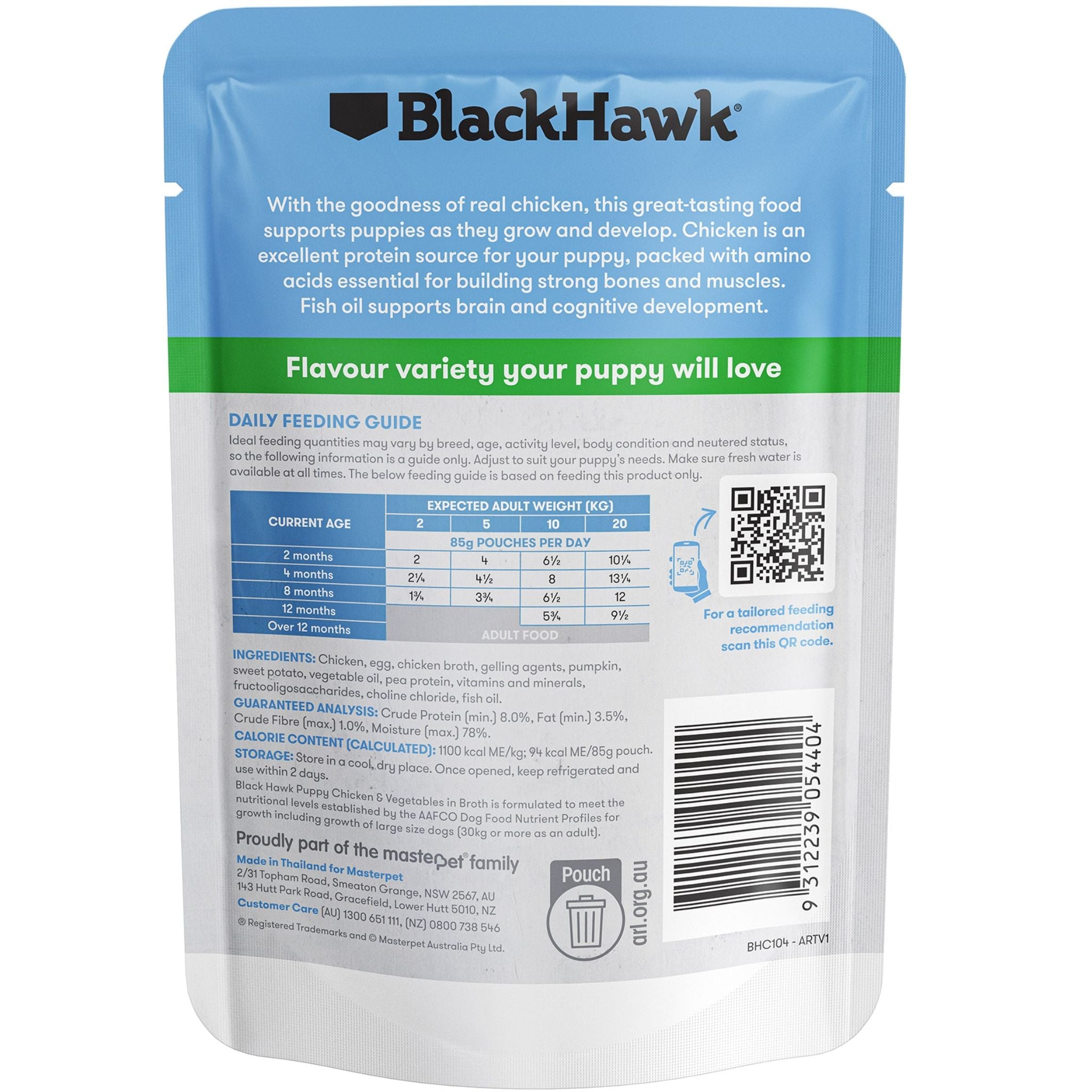 Black Hawk Puppy Chicken & Vegetables in Broth is formulated to meet the nutritional levels established by the Association of American Feed Control Officials (AAFCO) Dog Food Nutrient Profiles for growth including growth of large size dogs (30kg or more as an adult).