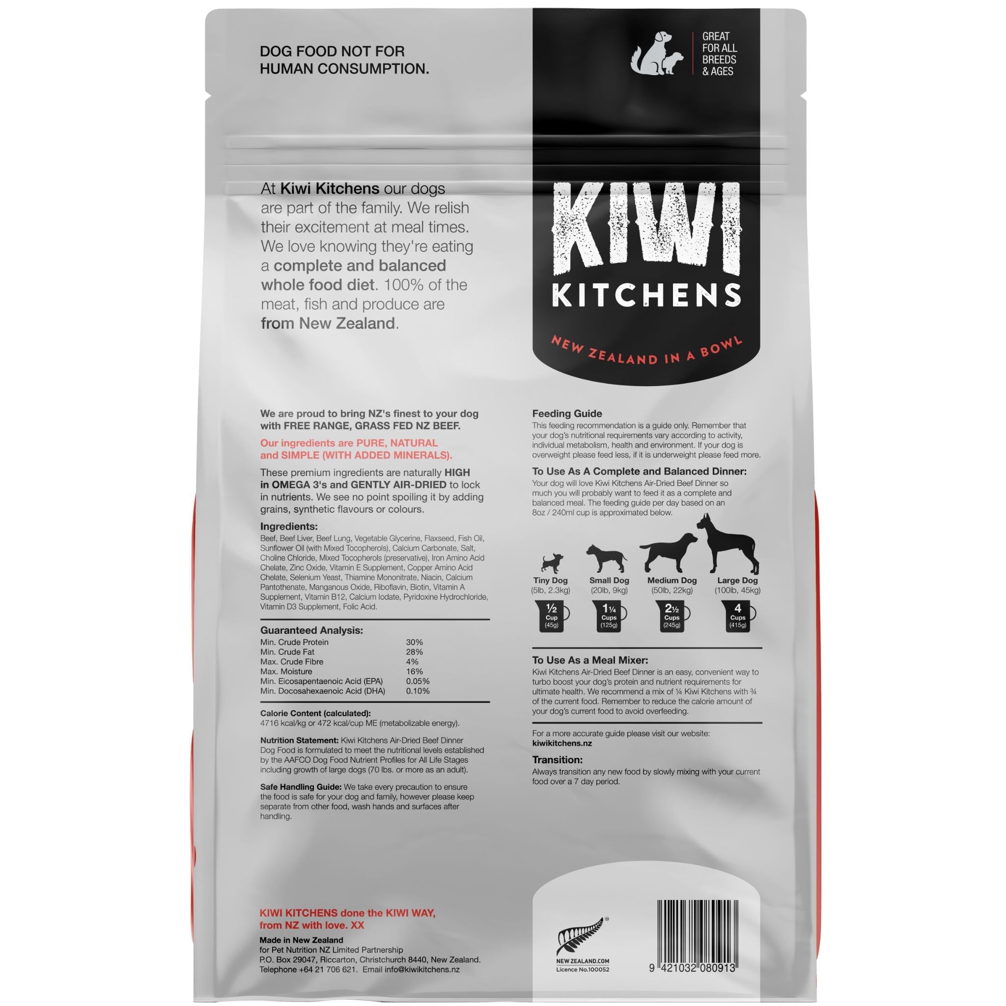 Your dog will love kiwi Kitchens Air-Dried Beef Dinner so much you will probably want to feed it as a complete and balanced meal. The feeding guide per day based on an 80z/240ml cup is approximated below