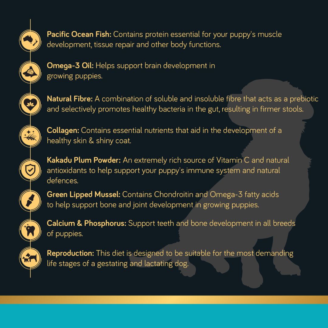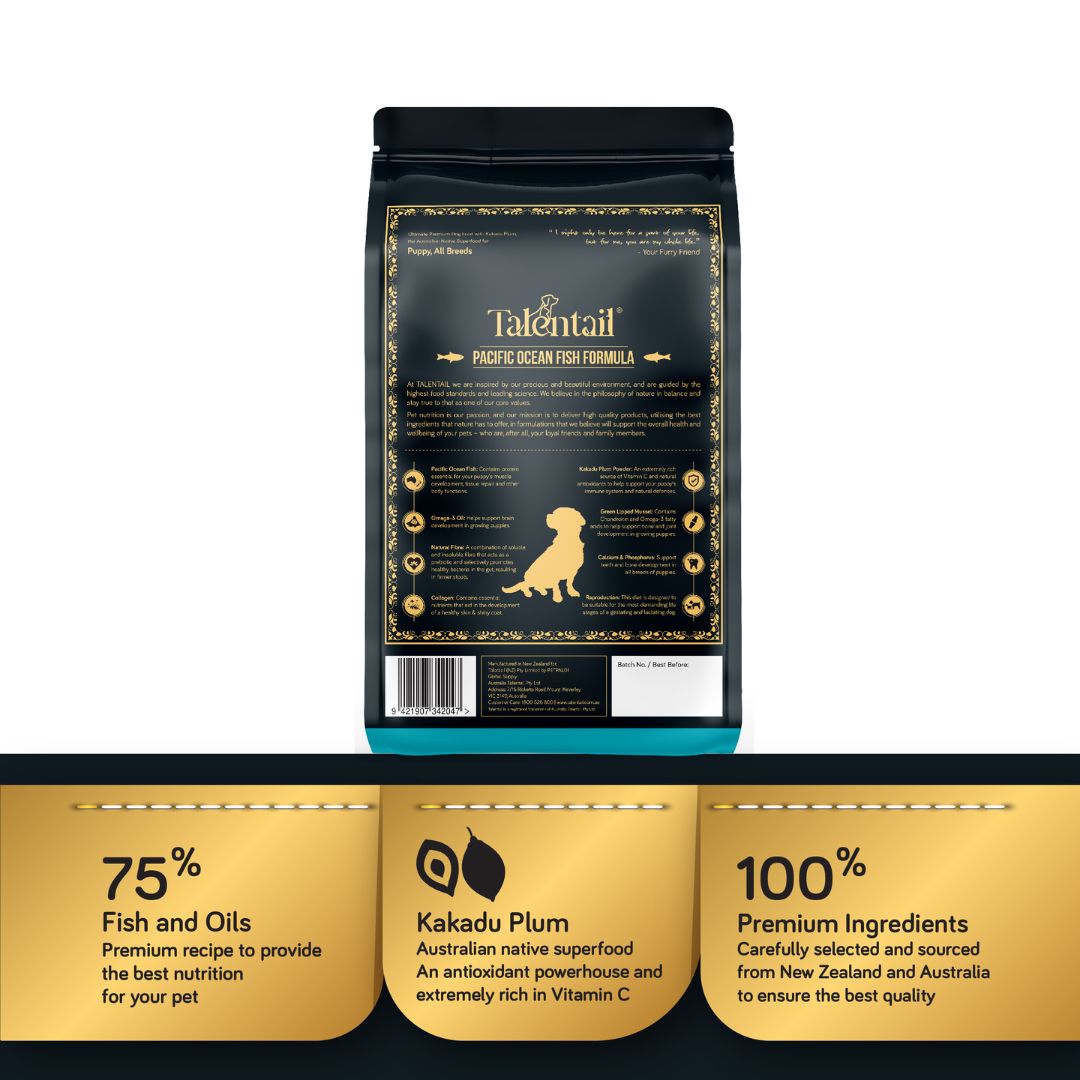Formulated with 75% Fish and Oils to more closely mirror the natural diet of your puppy’s ancestors. 100% premium ingredients. Packed with omega-3 fatty acids, it promotes brain development, healthy skin, and a lustrous coat. Crafted with sustainably sourced fish from the Pacific Ocean, This premium formula is grain-free, ensuring optimal digestion and energy levels. Nourish your pup's potential with Talentails Puppy Food.