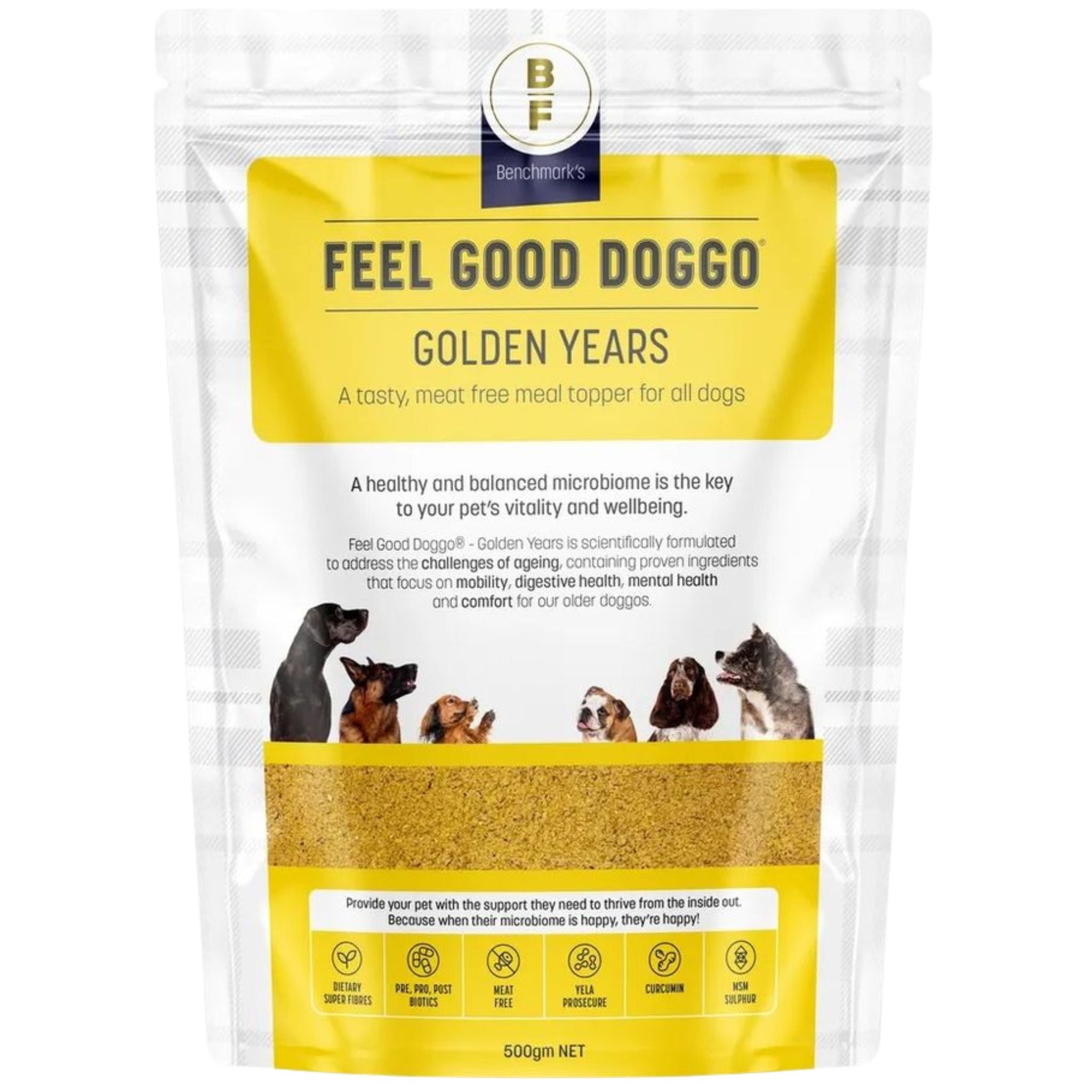 Feel Good Doggo® - Golden Years is scientifically formulated to address the challenges of ageing, containing proven ingredients that focus on mobility, digestive health, mental health and comfort for our older doggos.